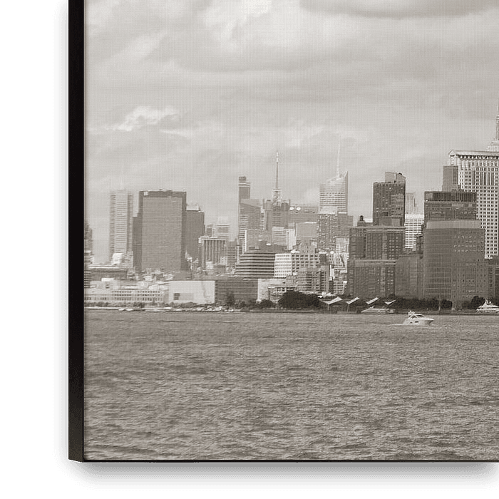 Prachtig panorama van New York, in sepia-kleur, vanaf het water gezien met oa de Freedom Tower. Op de achtergrond een mooie wolkenpartij. De afbeelding is er ook in zwart-wit én in een kleurenversie.