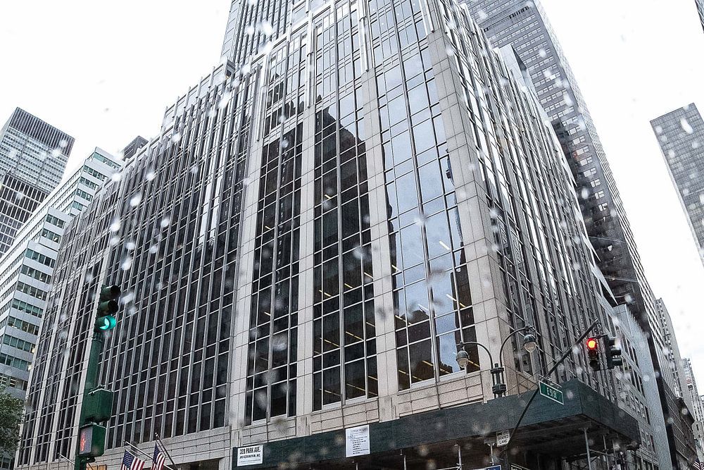 Fisheye photo of yellow cabs and skyscrapers in New York