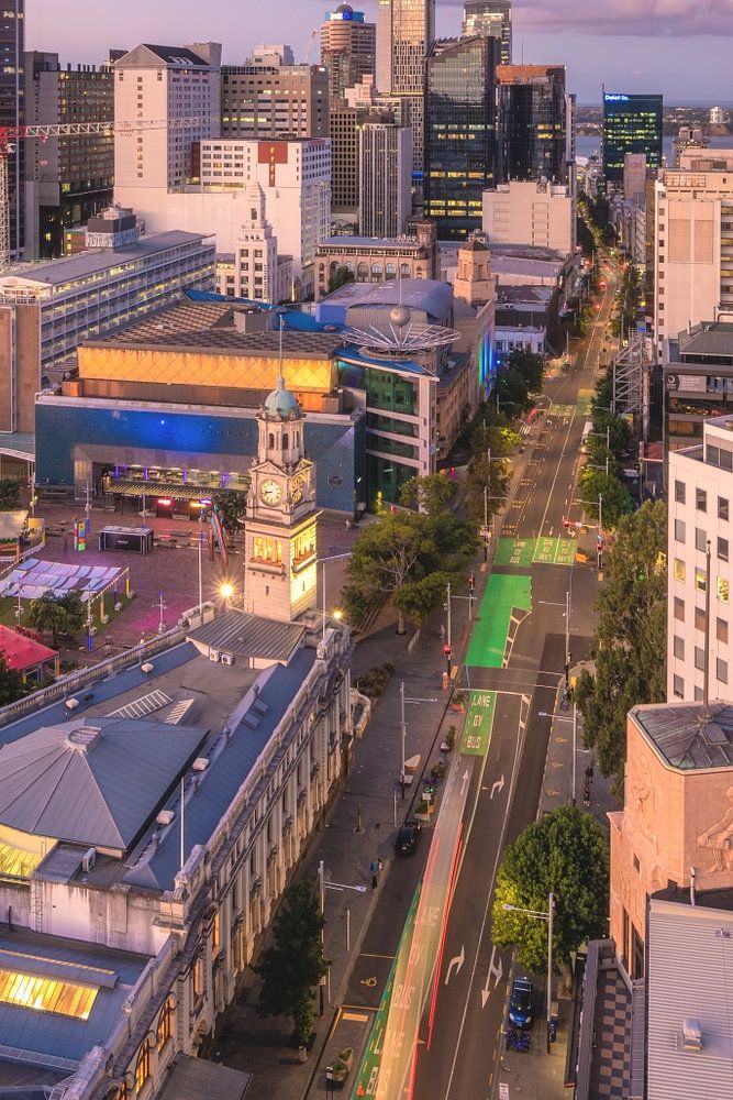 The skyline of Auckland on New Zealand's North Island shortly after sunset with the iconic Sky Tower.