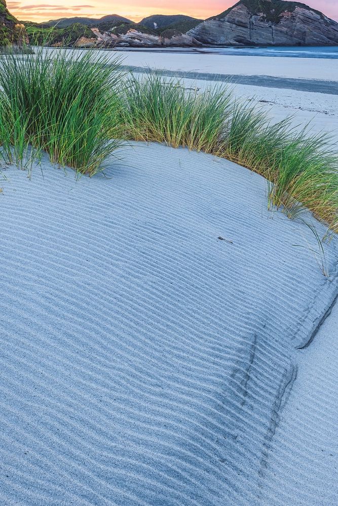 Beautiful sunset over Wharariki Beach on the South Island of New Zealand in Golden Bay.