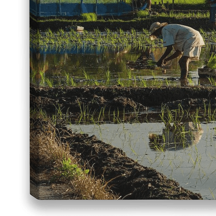 Rice workers planned new rice in the rice fields of Ubud, on the island of Bali in Indonesia. The morning light accentuates the fresh green of the new plants. The rice workers are reflected in the water.