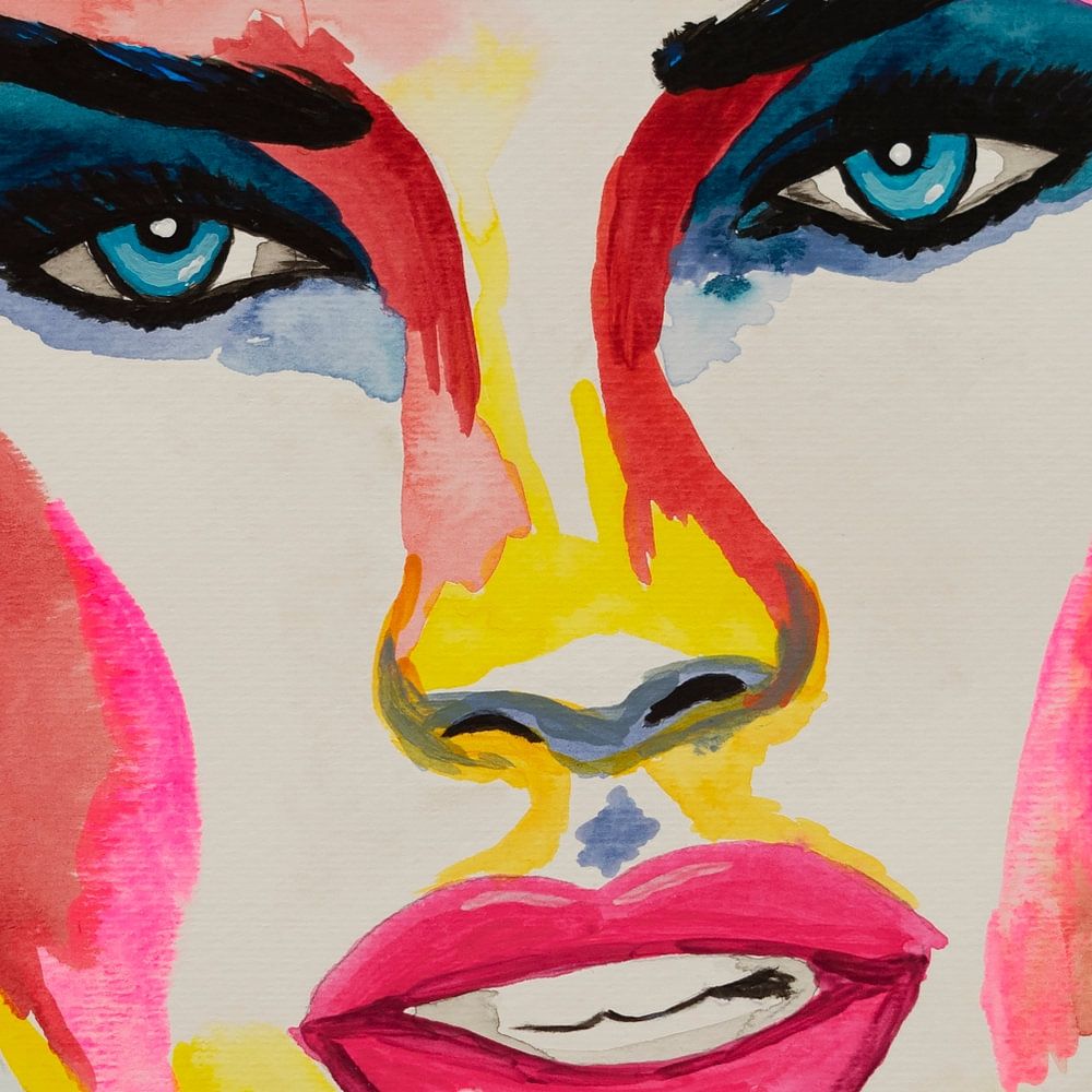 This painting was made as a watercolour but the technique is completely different. By using acrylic paint as a base, it managed to achieve much deeper colours than a normal watercolour. Glossy colour effects and glossy paint for the hair were also used for the original painting. These effects can be seen in the images of Werk aan de Muur
