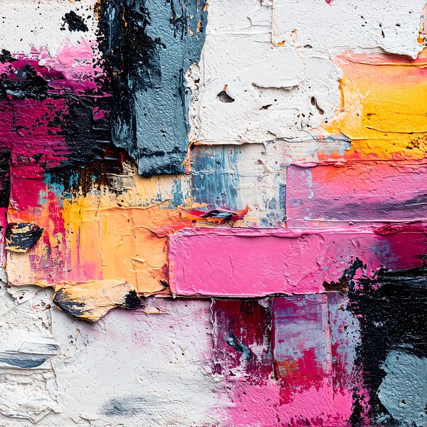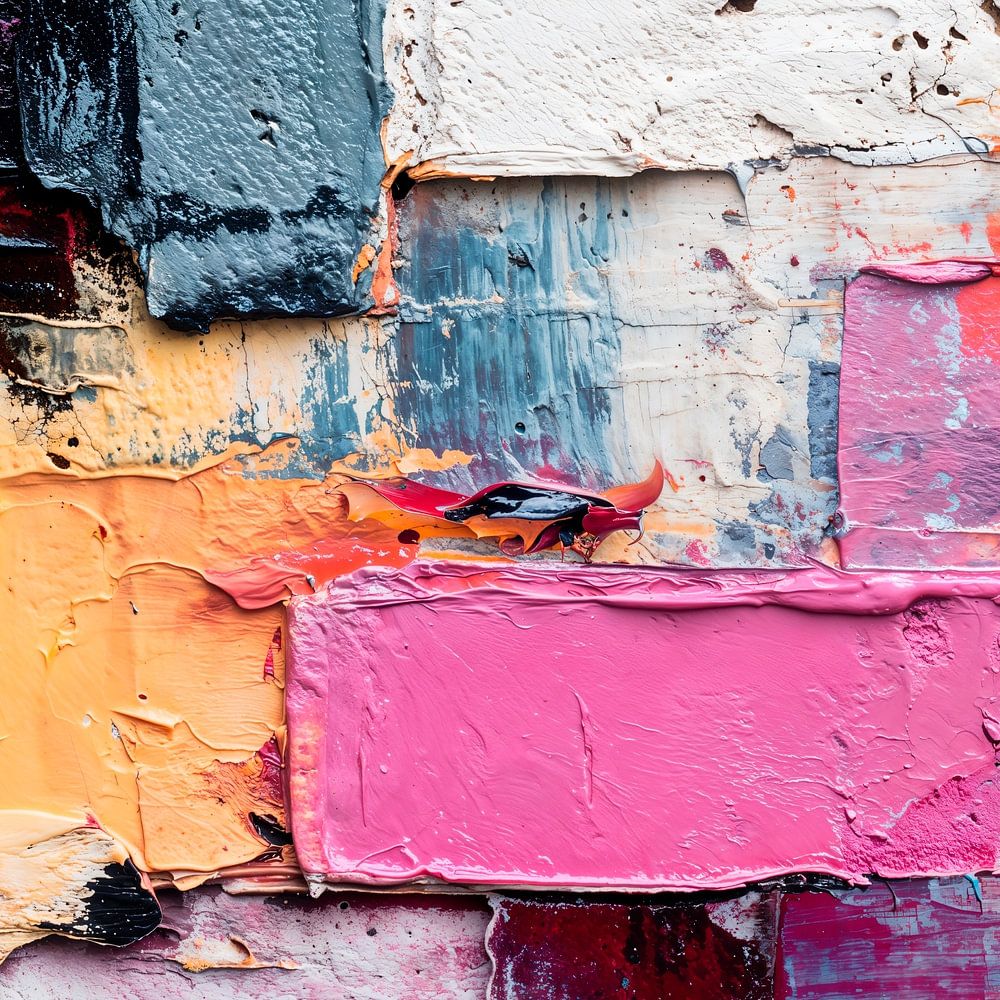 A vibrant abstract painting with thick impasto-like brushstrokes in various colours. The paint has been applied in layered textures, creating a sense of depth and movement across the canvas. The overall impression is energetic and expressive, with a dynamic interplay of colours and contrasting textures.