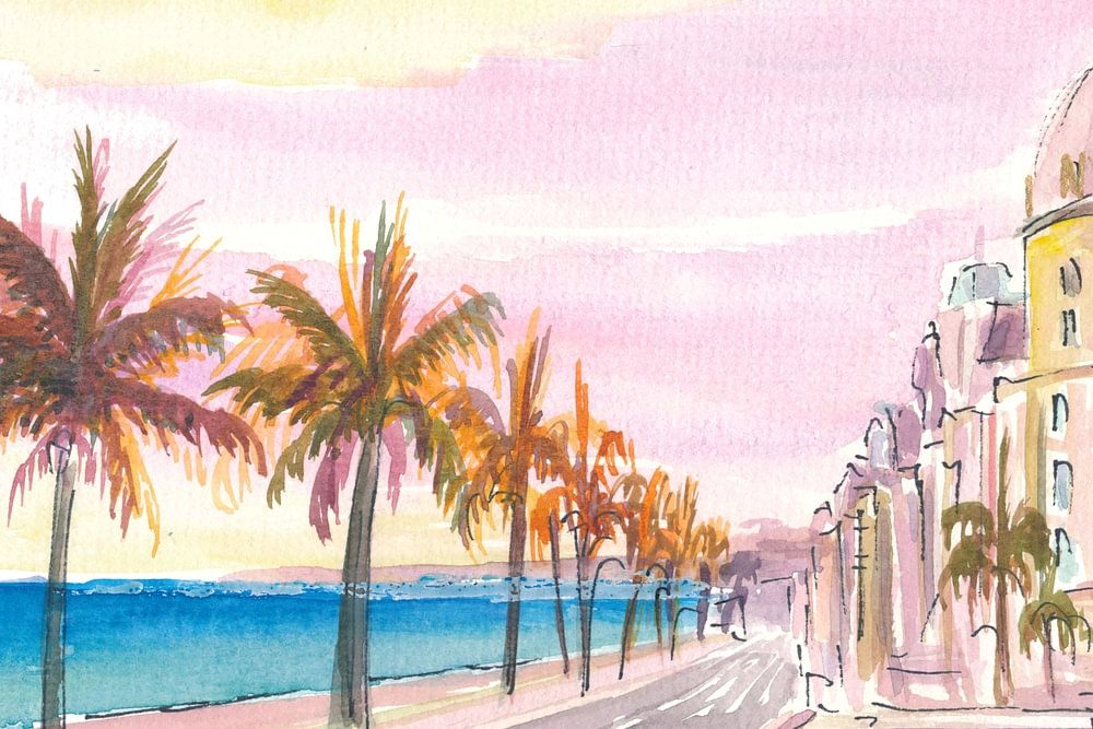 About "Nice France Riviera watercolour view of Promenade des Anglais"