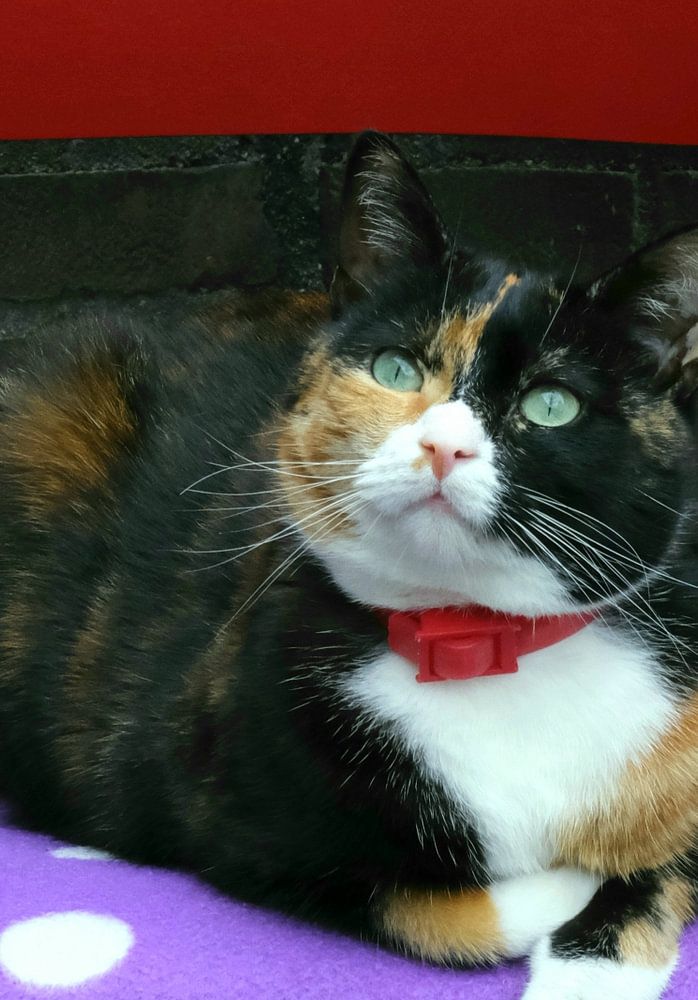 A unique colored cat or cloth cat who is chilling. This cat has a powerful appearance and looks good on your wall.