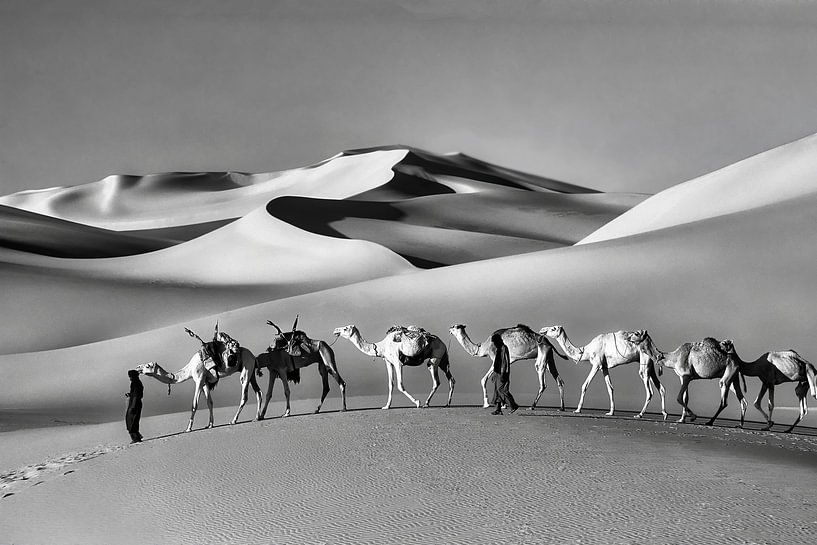 Niger, Agadez. Sahara Desert. People of the Tuareg tribe. Camel caravan. Sand dunes. Analogue, scan of slide, converted to black and white photography.