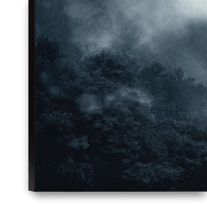 Wisps of mist above a forest hill in moonlight