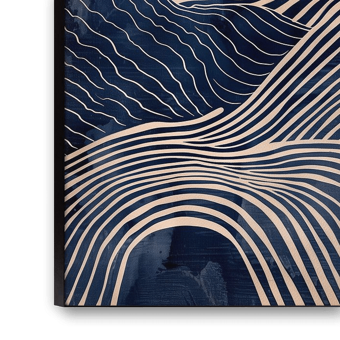 This work captures the hypnotic essence of waves under the moonlight, using a harmonious balance of navy blue and cream white. The repeating lines create a sense of movement and rhythm, while the dark background adds depth and mystery. It is a piece that exudes tranquillity but also intrigues, perfect for a space that desires a touch of elegance and contemplation. Whether in a quiet study corner or a lively living room, this piece brings a piece of nocturnal serenity to the home