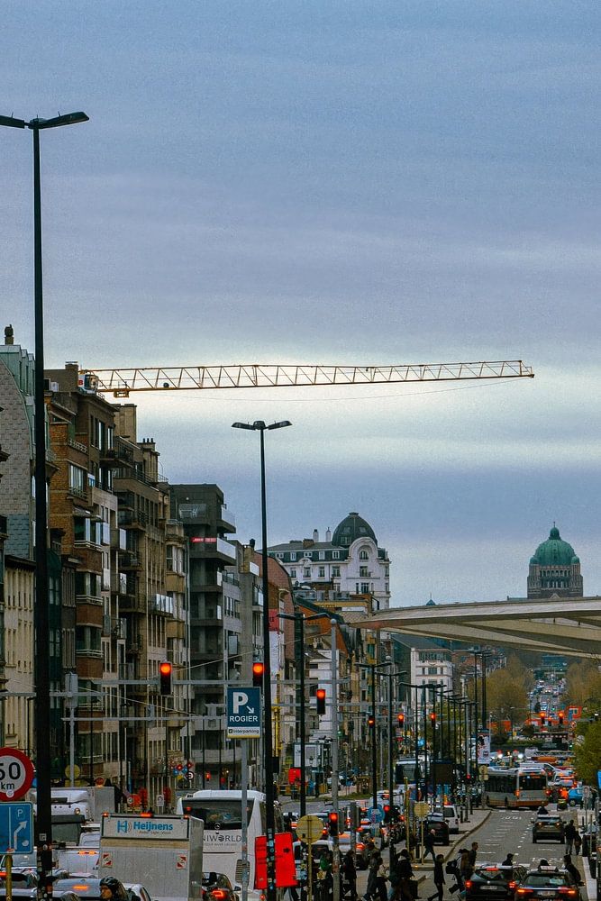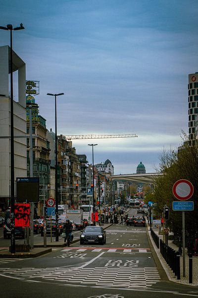 This atmospheric cityscape captures the bustling Kruidtuinlaan, one of the main thoroughfares in the centre of Brussels. In the distance stands the iconic dome of the Basilica of Koekelberg, which serves as a powerful visual anchor in this dynamic composition.