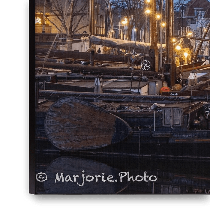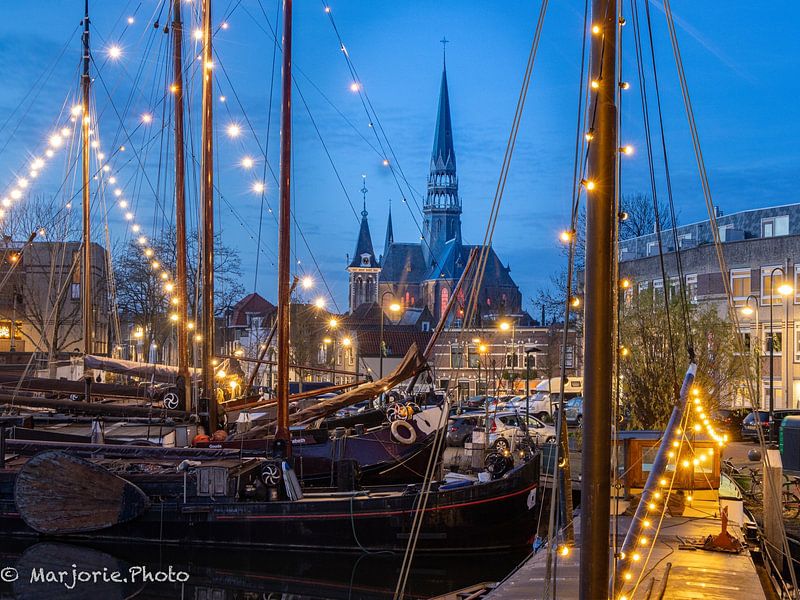 During the month of December, the boats in Gouda harbour are illuminated. Here is a lovely view of the church tower.