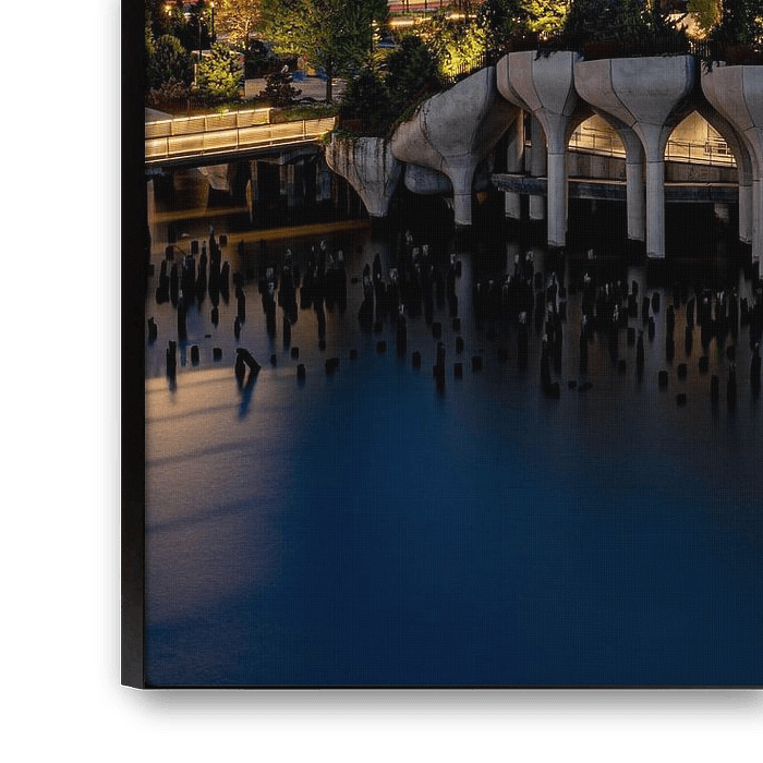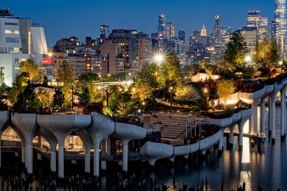 The photo "Night over New York - From Pier 57 to the WTC" captures the breathtaking beauty of the New York skyline in a tranquil yet vibrant moment. From the rooftop terrace of Pier 57 Rooftop Park, the image offers a mesmerising view across shimmering Little Island to the iconic World Trade Center.