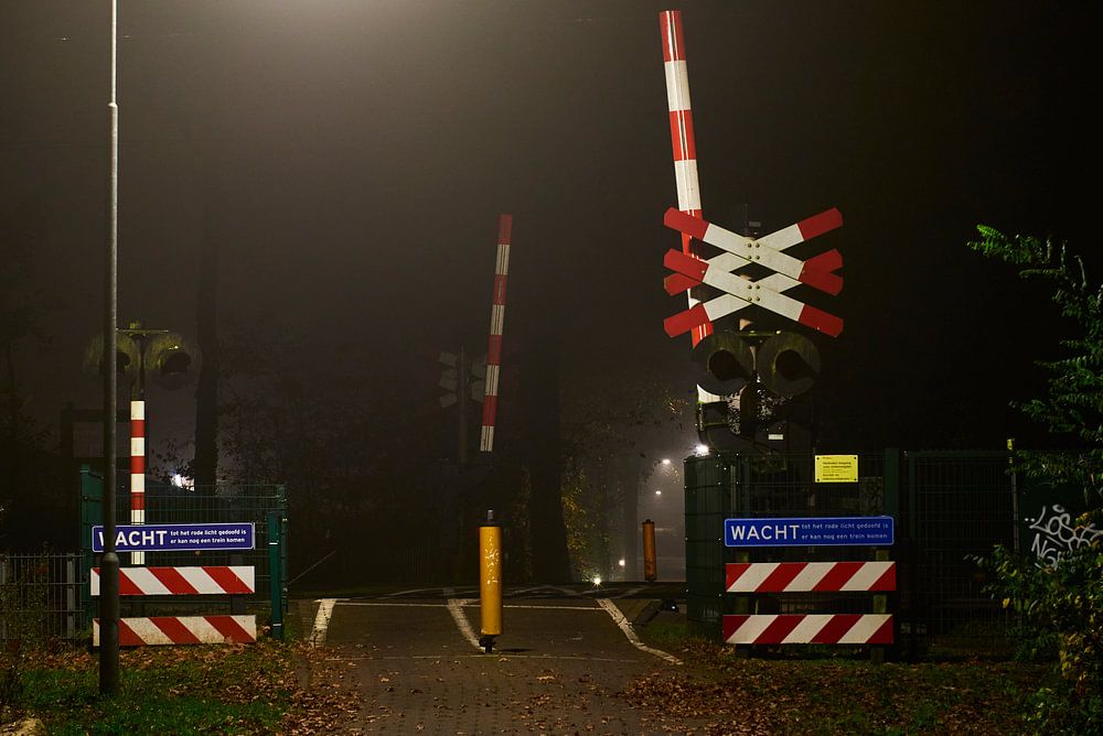 A night shot of a secured level crossing in the Veluwe village of Nunspeet. Because of the water in the fog, the light becomes different, which gives it its own atmosphere.