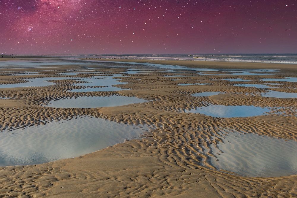 Night sandy beach landscape Dutch coast during low tide with puddles against background with blue violet starry sky