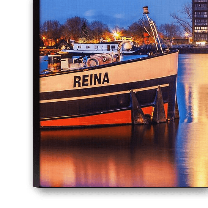 Long exposure shot of the Tasman tower in the city of Groningen. Blue sky with warm yellow reflection in the water from the lights. a freighter on the left and a jetty on the right.