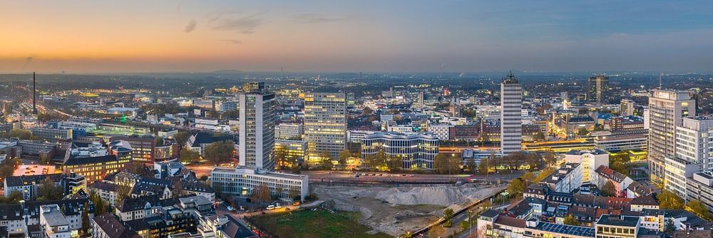 I captured this panoramic view of Essen's skyline on an autumn evening. The image is composed of multiple frames, stitched together to showcase the expansive cityscape of Essen, one of North Rhine-Westphalia's major urban centers, while preserving every detail of its vibrant nighttime skyline.