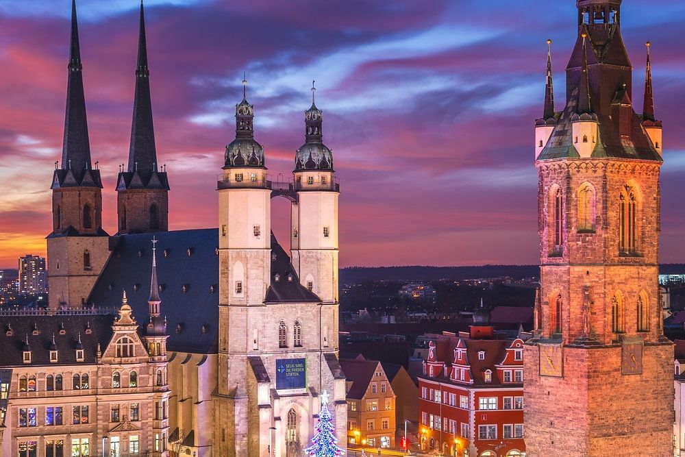 Night skyline of Halle (Saale), Germany with the famous five towers and Christmas market