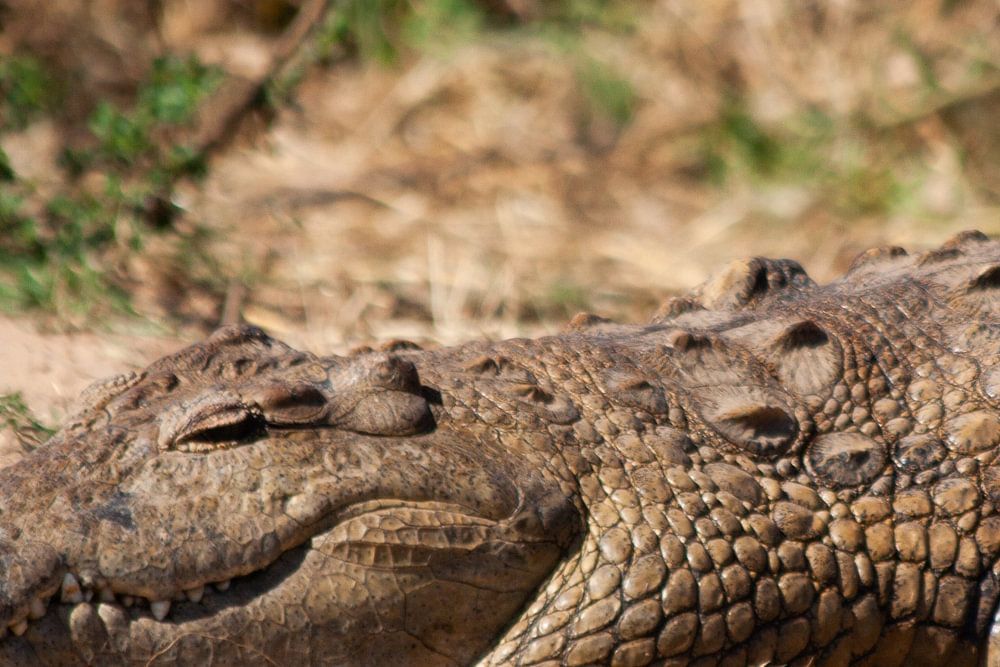 A Nile crocodile lies sunbathing on the sand to warm up. An image showing the front part of the crocodile a some vegetation in the background.