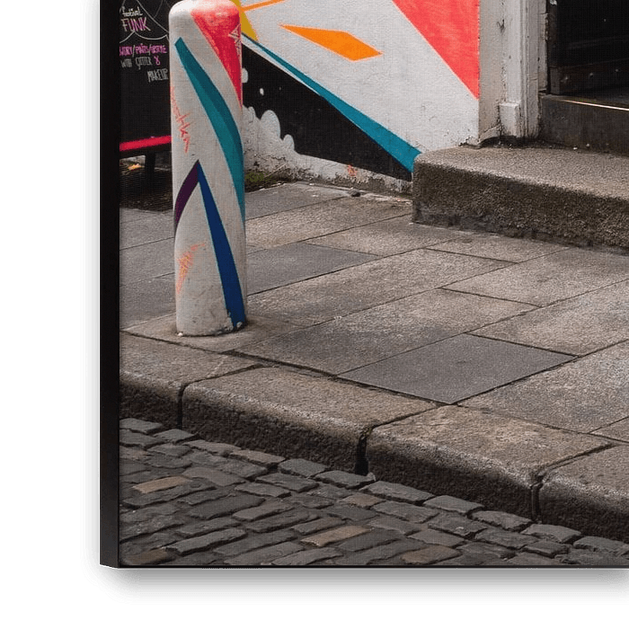 The warm colours of the café, the street and the painting typify Dublin at its best: vibrant, playful and full of little visual surprises. This image captures the charm of a city where humour is in the walls, and where even a skull kindly addresses you with: No worries.