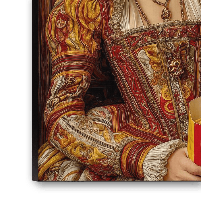 A humorous artwork in which an elegant noblewoman in rich baroque costume unexpectedly poses with a tray of modern fast food fries, creating a cheerful and playful atmosphere. The combination of classical painting techniques, refined details and a contemporary twist creates a charming contrast that immediately evokes a smile. This piece fits beautifully into classic, modern chic and eclectic interiors and is an original eye-catcher for kitchen, dining room, living room or hallway.
