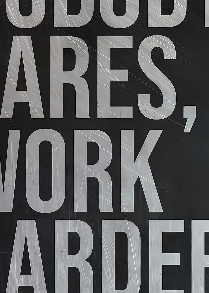 This printed poster features a motivational phrase: Nobody Cares Work Harder. Perfect for anyone needing inspiration and motivation in life and work. Great gift for those who thrive for success and positivity in the mind. Add this inspirational art to your man cave or work zone!