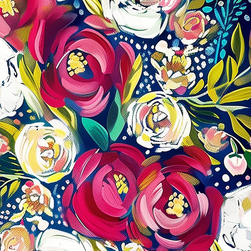 Bursting with vibrant colours, this expressive artwork playfully depicts a floral ensemble against a dark blue background, creating a strong contrast. The painting features a rich variety of flowers, including prominent roses in shades of deep red and bright white, surrounded by smaller flowers and dainty leaves in green, yellow and pink.
