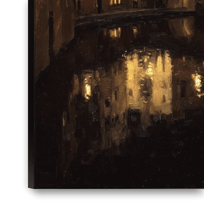 Night prevails in this work. The canal is almost black, the water deep and mirror-like. Only a few light sources illuminate the facades and bridge arches, creating a dramatic contrast between gold and dark blue. The brushstrokes give the whole a subtly moving character, as if the air and water are still vibrating.