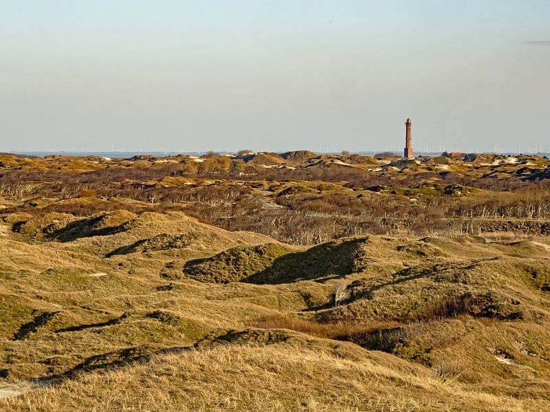 View of the dune landscape of the German North Sea island of Norderney with its historic lighthouse.