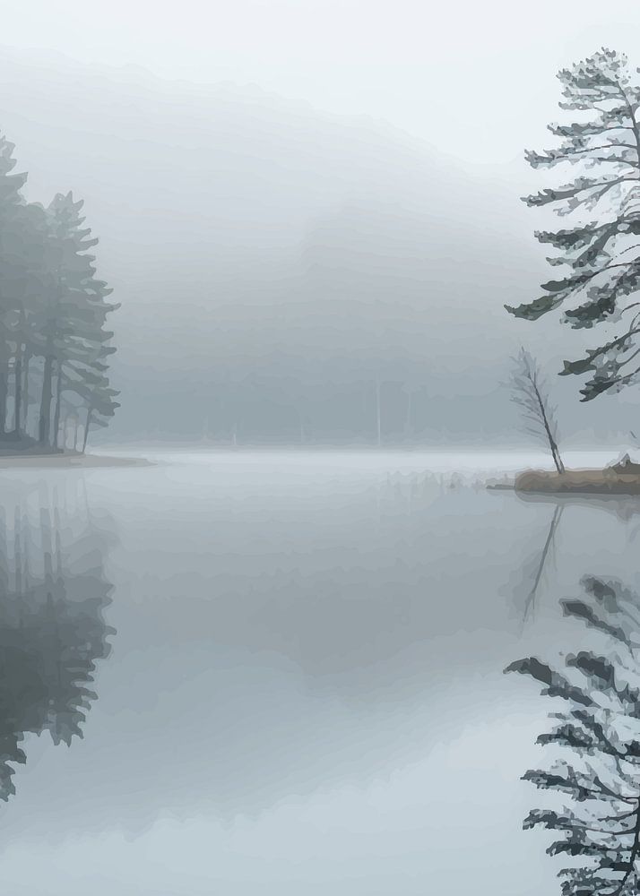 Still water mirrors tall trees in a peaceful Scandinavian lake under soft fog. Quiet and contemplative.