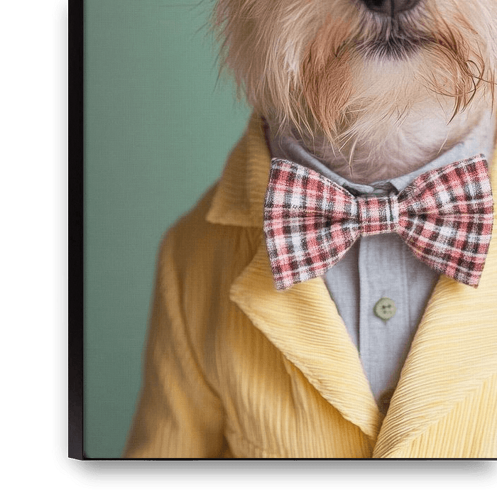 A Norfolk Terrier with a smart chequered hat and an elegant bow tie inspires in the simplest, yet charming look. His large, lively eyes radiate cleverness, while his soft, tousled coat and cheerful demeanour whisper happy tales of adventure in your ear. A true gentleman of the four-legged world!