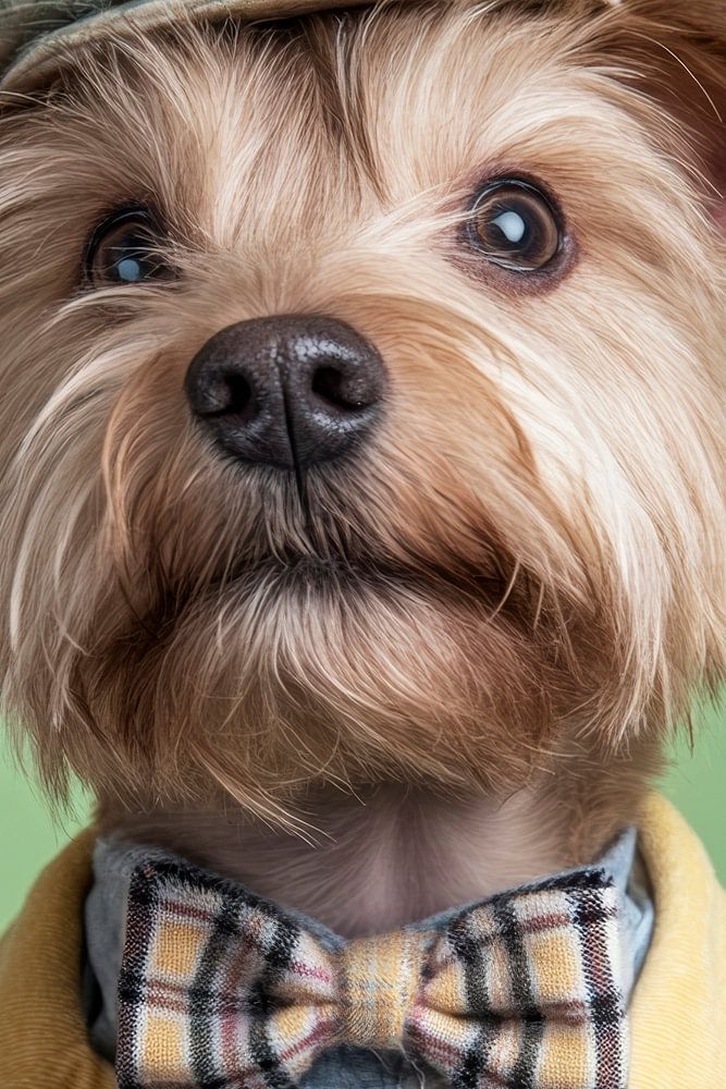With a cheeky look and elegant attire, this Norfolk Terrier exudes charm and style. His knitted hat and dotted bow tie add a touch of nostalgia, while his velvety, furry ears listen curiously to everything around him. A little gentleman ready to conquer the world!