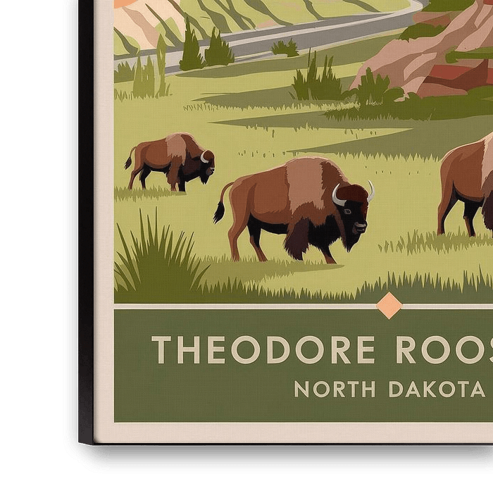A picturesque scenery full of majestic mountains and rolling hills, populated by wild bison, creates a harmonious connection to nature. The warm colours of the sunset give the room an inviting atmosphere. This artwork is perfect for the living room, where it tells stories of adventure and freedom.