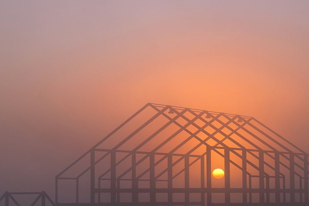 Daybreak behind the slagheap house at Halde Norddeutschland, Neukirchen-Vlyn on the Lower Rhine, North Rhine-Westphalia