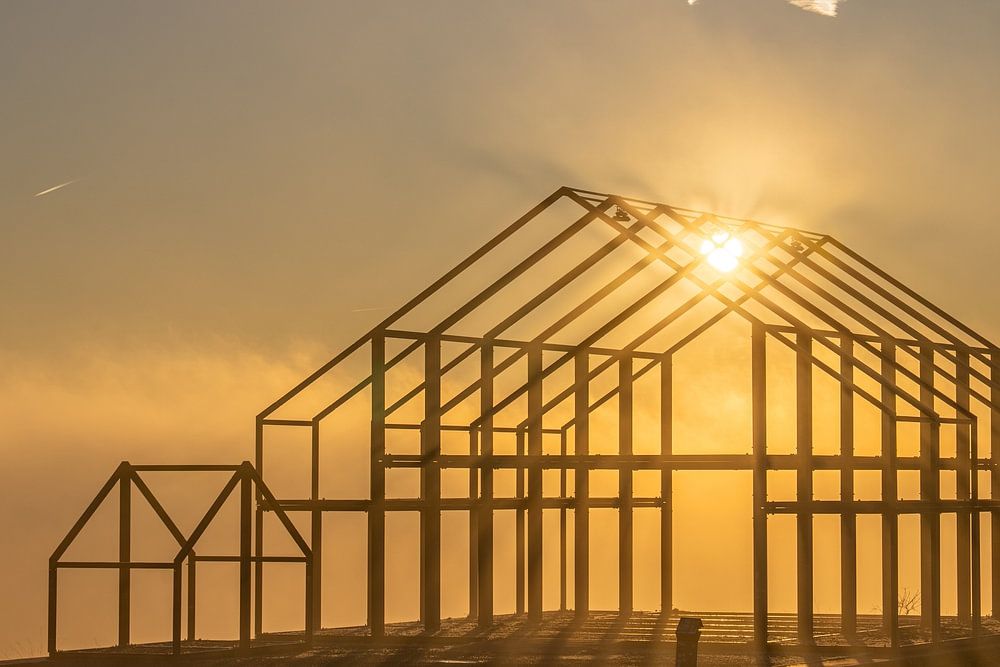Daybreak behind the slagheap house at Halde Norddeutschland, Neukirchen-Vlyn on the Lower Rhine, North Rhine-Westphalia