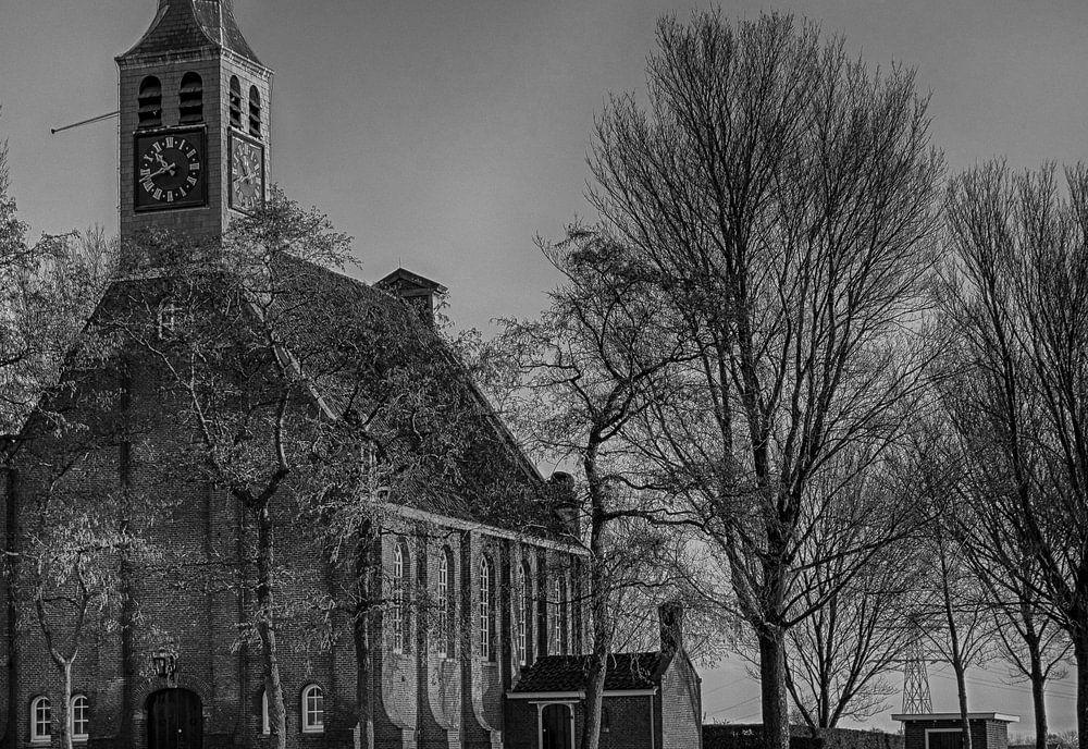 North Holland Krommenie reformed Church on the Krommenie with pasture in black and white.