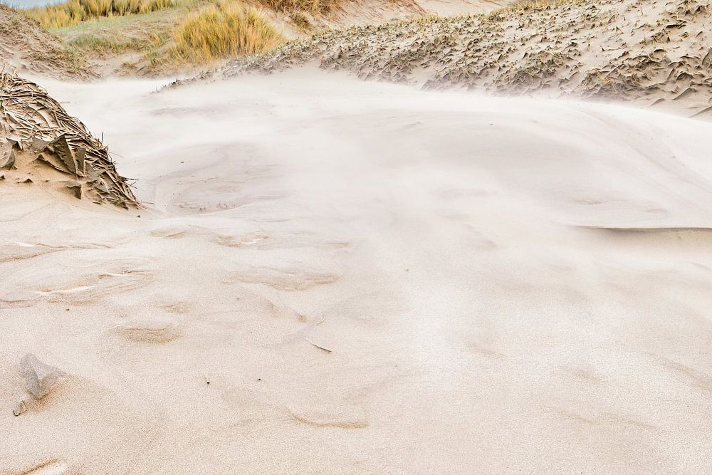 A view in winter from the Dutch coast. The North Sea coast with the dune during a storm. A close-up of the dune with lots of drifting sand due to strong winds. Good to see the sand drift and flat marram grass due to the wind.