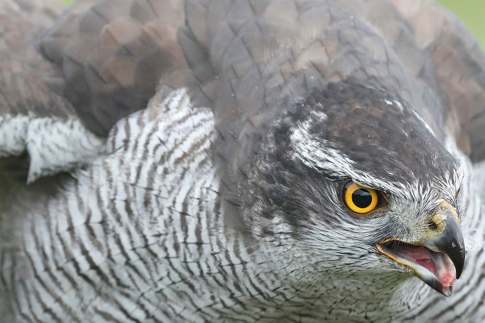 A Northern Hoshawk briefly looking up while eating a pigeon. This Northern Goshawk is a powerful hunter, taking birds and mammals in a variety of woodland habitats, often utilizing a combination of speed and obstructing cover to ambush their victims. Northern Goshawks often forage in adjoining habitat types, such as the edge of a forest and meadow.