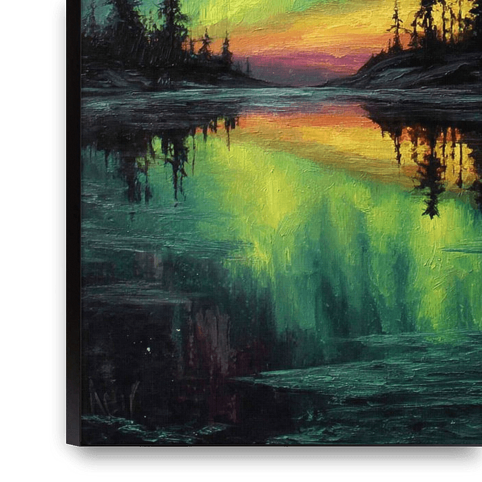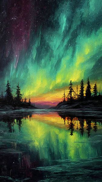 This stunning artwork captures the ethereal beauty of the Aurora Borealis dancing across a starlit sky. Executed in a rich impasto oil style, the piece features vibrant streaks of emerald green, deep violet, and shimmering gold that reflect brilliantly off a tranquil forest lake. The silhouetted pine trees provide a grounding contrast…