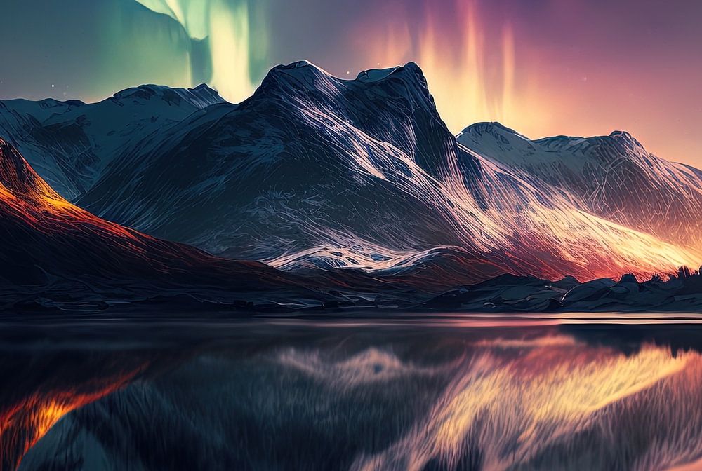 This unique artwork poetically showcases the beauty and power of the Northern Lights. The painting shows a surreal representation of the Northern Lights, with its blowing waves and colourful bursts, as the glow reflects on the calm waterfront. This artwork is sure to leave a lasting impression on all who view it.
