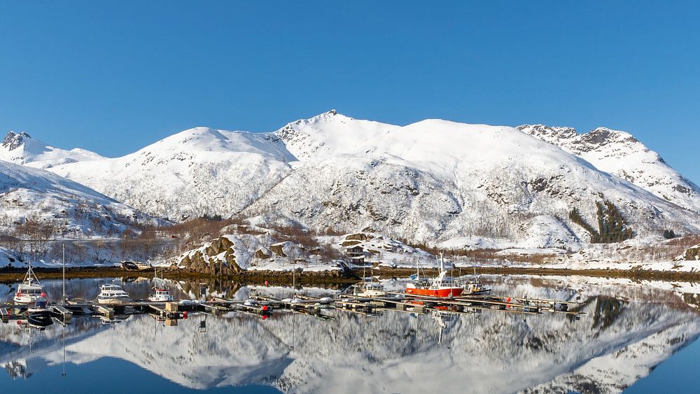Small harbour on the Lofoten(Norway) at calm with reflection of the snow-covered mountains in the background.