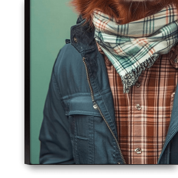 With bright red fur and gentle, lively eyes, this Nova Scotia Duck Tolling Retriever exudes charm and intelligence. Dressed in fashionable plaid flannel and an elegant scarf, he effortlessly embodies a sense of adventure and style. His coiffed mane and alert demeanour pique interest and promise exciting adventures.