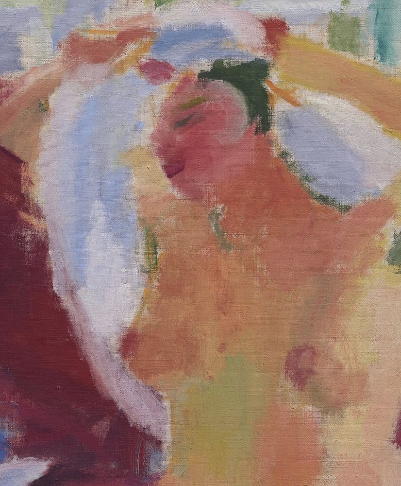 A woman sits nude in this portrait, a nude portrait while dressing up. Ferdinand Schirren (Antwerp, Flanders, Belgium 8 November 1872 - Brussels 19 February 1944) was a Belgian painter, draughtsman, watercolourist and sculptor.