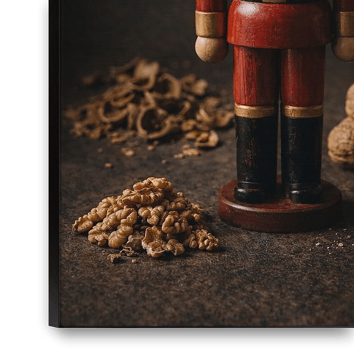 A large wooden nutcracker stands upright, like a silent sentinel. His red uniform bears traces of use, his jaws enclose a single walnut - the moment just before the act. At his feet lie shelled walnuts, irregular and fair. Behind him rest the broken husks, the silent evidence of what has already happened. To the right, a fresh supply…