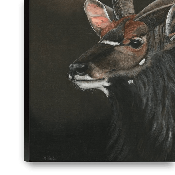 Portrait of a male nyala antelope with characteristic spiral horns against a dark background. Painted with Schmincke watercolours on Hahnemuehle "Britannia" paper sheet.