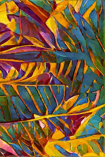 Abstract impression of autumn leaves that are partly or completely weathered. Some leaves still show some leaves, while others show only a few veins. In ochre, yellow, green, reddish and brownish and faint violet and bluish colours.