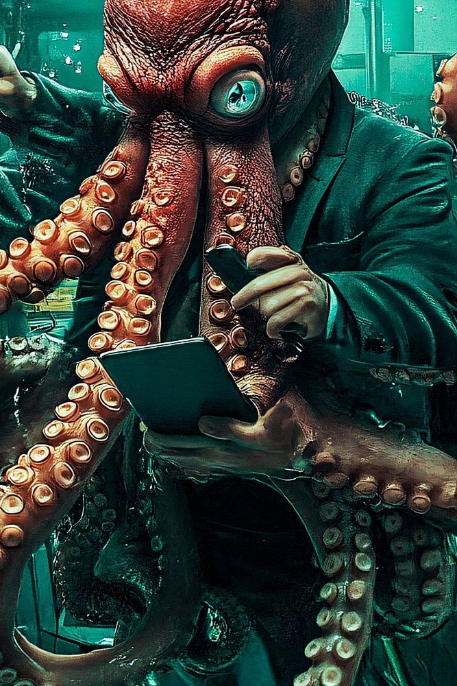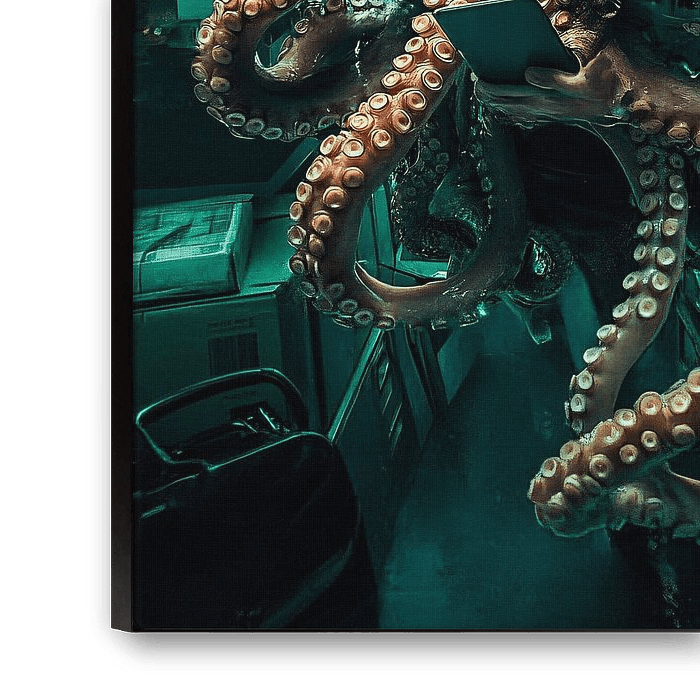 This unique image shows an imaginative octopus in a busy office environment. The octopus wears a neat suit and uses its many tentacles to control multiple gadgets and devices, reflecting the hectic and multitasking nature of the modern world. With a surreal underwater atmosphere and striking colours such as green and blue, this design immediately grabs attention. It is perfect for lovers of creative and humorous art. This visual mix of technology and nature makes it ideal for an office space or modern interior design. Add a playful and inspiring touch to your environment with this unique artwork!