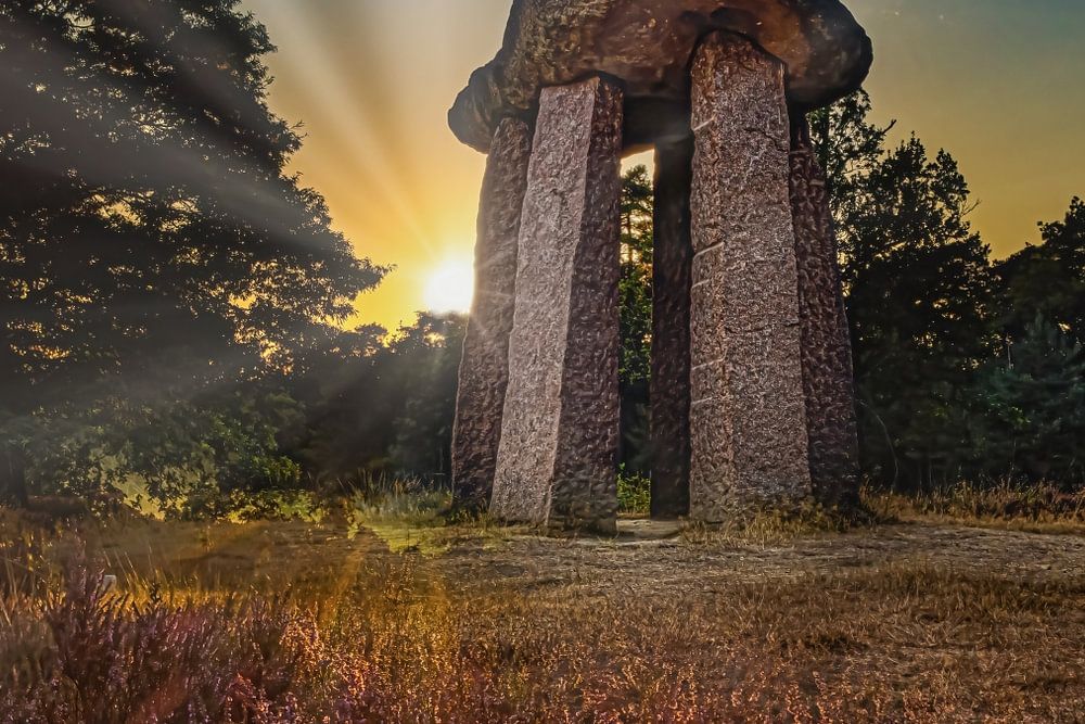 In the State Forests near Poolshoogte (Odoorn) on a heathland stands this work of art. It was made by Rob Scheefel and it is called "Ode to the Sun". He calls it a landscape stamp. The picture was taken on 22-08-2022, about half an hour before sunset. It consists of 6 granite columns with a large boulder on top.