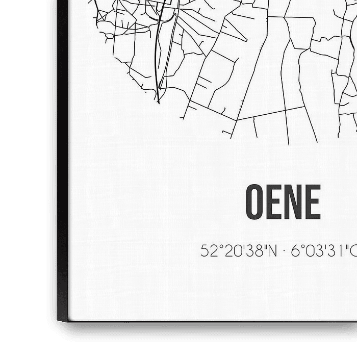 Black and white map, street map or street plan of Oene. Oene is located on the Veluwe, in the municipality of Epe, province of Gelderland. On the city map all public roads in Oene are included. Furthermore, the map is provided with the coordinates of the center of Oene.