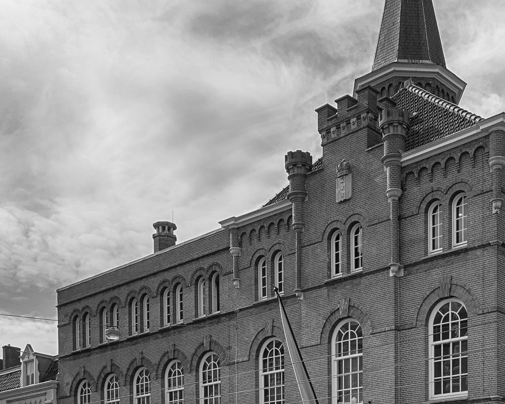 On Marnixstraat in Amsterdam stands the Raampoort, a national monument that was built in 1888 according to a design - a mixture of neo-classical and medieval elements - by architect W. Springer. The building has served as a police station for many years. Behind the building is the Singelgracht. This black and white work is also available in colour on request.