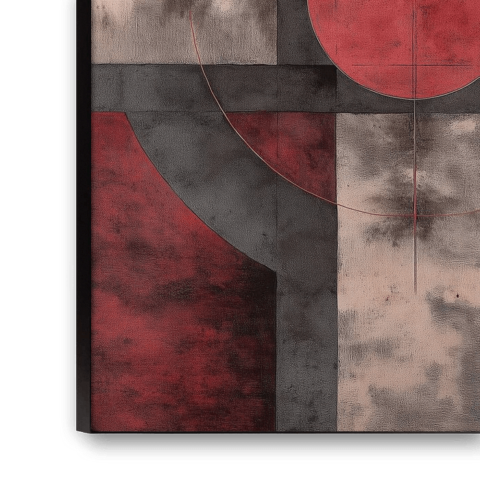 Kantoor Wanddecoratie | Rode As - Dit werk voelt als een strak ingemeten rustpunt voor een kantoor of vergaderzaal: ordelijk, doelgericht en tegelijk zacht in zijn aanwezigheid. In het midden staat een volle ronde schijf — een rood, licht geaderd centrum dat als een kompas of doelwit leest — omlijst door een dunne incisie die de cirkel benadrukt. Daarom is dit abstract schilderij zo geschikt voor een kantoorinterieur: de compositie geeft een visuele richting zonder te commanderen, een geometrisch schilderij dat de ruimte georganiseerd houdt maar niet kil maakt.