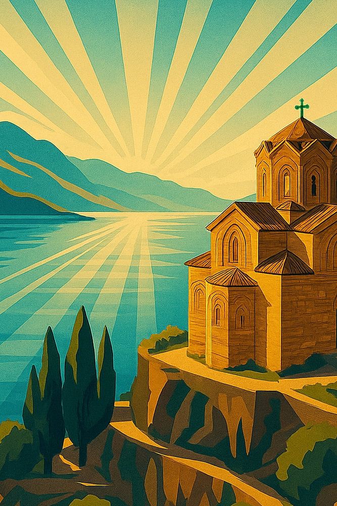 This vintage-inspired Ohrid Art Deco poster captures the timeless beauty of one of the Balkans’ most iconic destinations. The artwork highlights the serene waters of Lake Ohrid, framed by dramatic mountains and the historic cliffside church that symbolizes the city’s spiritual and cultural heritage. Designed in a bold Art Deco style, the poster uses vibrant blues, golden sunlight, and stylized rays to evoke a sense of adventure and elegance. Ideal for collectors of travel wall art, this print celebrates both architectural detail and natural splendor. Whether you’ve visited Macedonia or dream of exploring its lakeside towns, this Ohrid poster brings the atmosphere of the Balkans into your home. Perfect for living rooms, offices, or creative spaces, it blends vintage aesthetics with modern design trends. A striking choice for those who love retro travel posters, European destinations, and timeless wall decor.